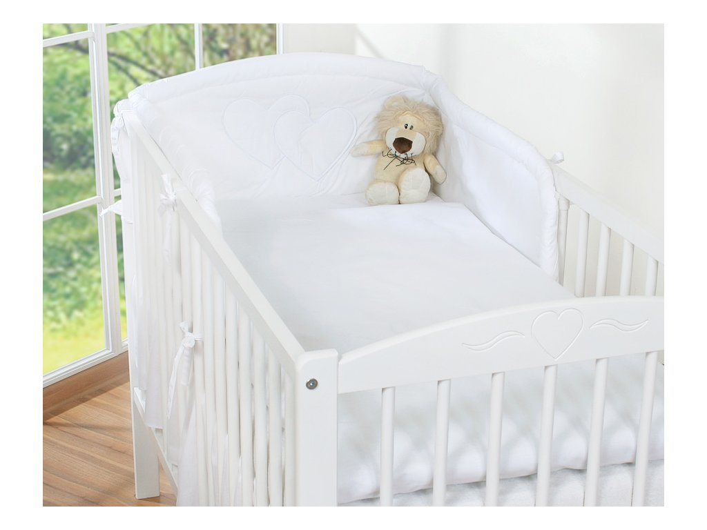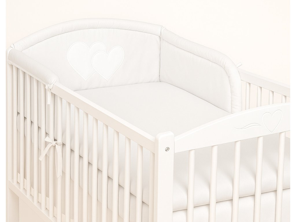 Mantinel je zaoblený, dodatečně prošívaný. K postýlce se přivazuje šňůrkami. Část mantinelu, která je za hlavičkou miminka, je zdobena velkou nášivkou srdíček.