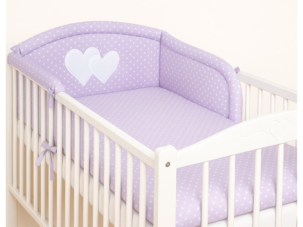 Mantinel je zaoblený, dodatečně prošívaný. K postýlce se přivazuje šňůrkami. Část mantinelu, která je za hlavičkou miminka, je zdobena velkou nášivkou srdíček.