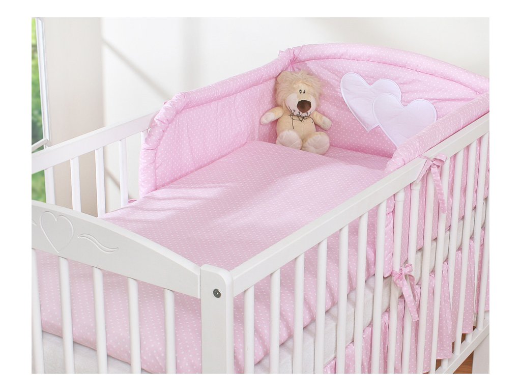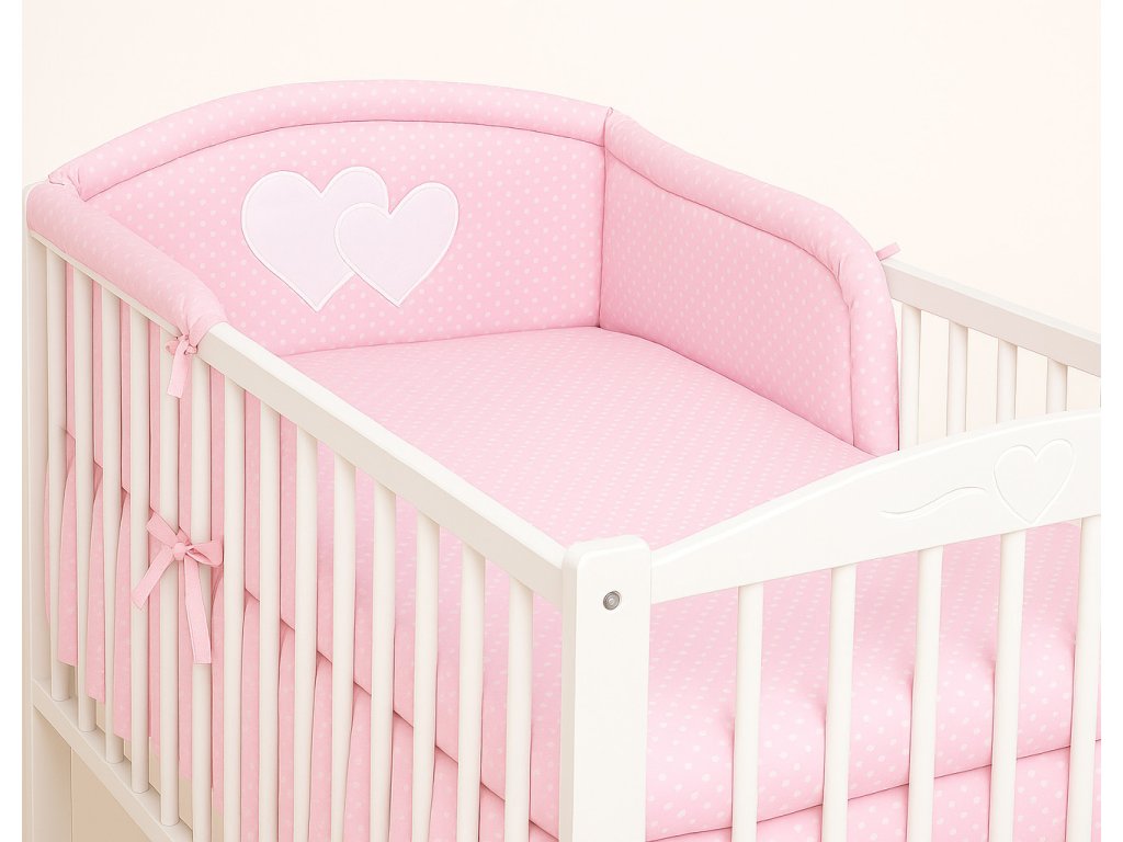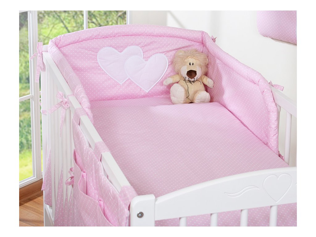 Mantinel je zaoblený, dodatečně prošívaný. K postýlce se přivazuje šňůrkami. Část mantinelu, která je za hlavičkou miminka, je zdobena velkou nášivkou srdíček.