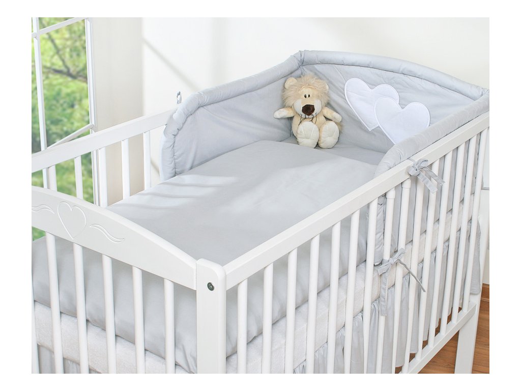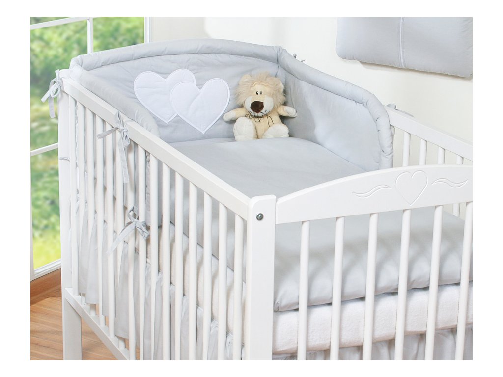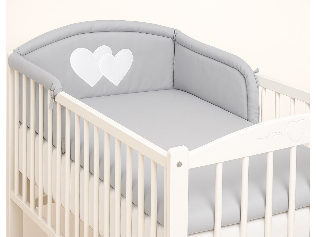 Mantinel je zaoblený, dodatečně prošívaný. K postýlce se přivazuje šňůrkami. Část mantinelu, která je za hlavičkou miminka, je zdobena velkou nášivkou srdíček.
