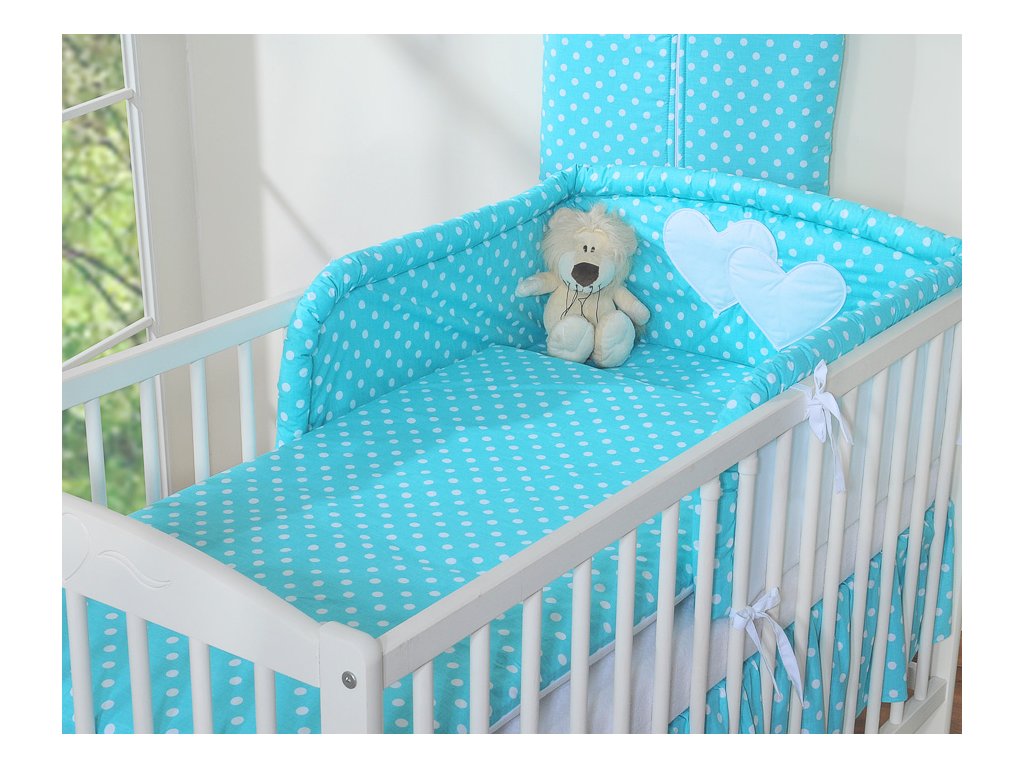 Mantinel je zaoblený, dodatečně prošívaný. K postýlce se přivazuje šňůrkami. Část mantinelu, která je za hlavičkou miminka, je zdobena velkou nášivkou srdíček.